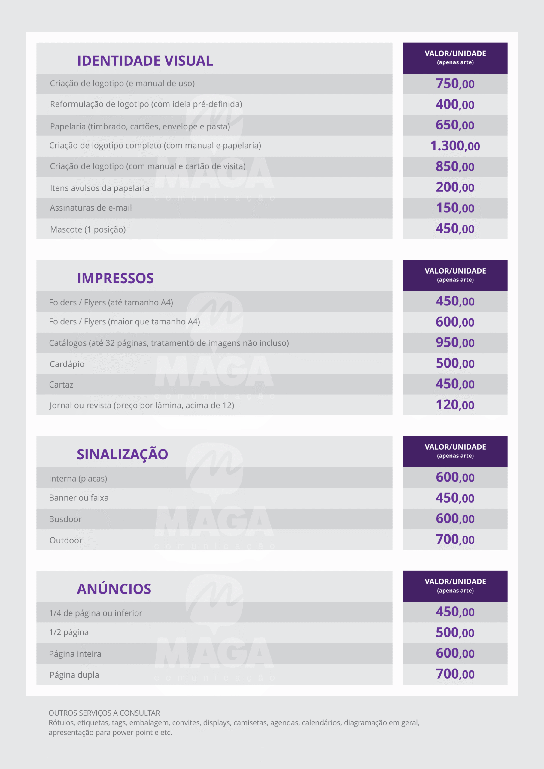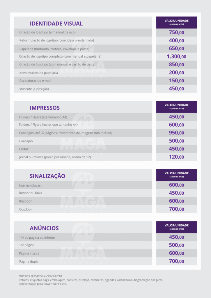 A MAGA faz a arte, prepara os arquivos para impressão e você manda para sua gráfica de preferência. A maioria dos arquivos vai nos formatos .ai, .cdr, .pdf, .jpg e/ou .png.
