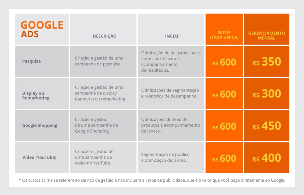O ‘setup’ ou ‘configuração inicial’ é o trabalho estratégico e técnico que a MAGA realiza uma única vez para lançar a campanha. São várias ações para que a campanha comece da maneira mais correta possível, o que é fundamental para o sucesso a longo prazo. Essa taxa cobre todo o trabalho manual e de planejamento necessário para tirar o projeto do papel, antes mesmo de a campanha começar a rodar. Após essa etapa, o custo de gerenciamento mensal é cobrado para a otimização e manutenção contínua. Inclui: